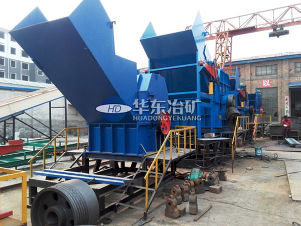 原料從輸送機送至低轉速破碎機,雙刀盤內向轉動,對大塊原料進行,切割,撕扯,擠壓等物理破碎方式,將其破碎至尺寸統(tǒng)一的小塊狀,然后由輸送機送至,二次中速粉碎機,采用多錘頭對其進行捶打,研磨,直至含鐵物料成分離狀態(tài),通過出料篩網控制其成品尺寸,根據成品尺寸決定用那種分選設備對其進行鐵分離。