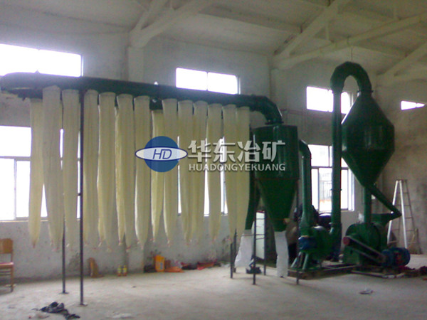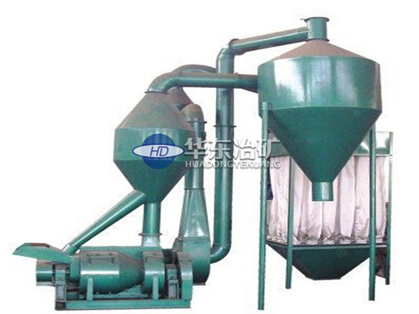 物料從進料口傾斜角度不斷加料至排粉碎腔內,經道打板不斷反復機打至耐磨襯板形成反復碰撞和機打過程,在機打過程尺寸縮小的物料會在高壓氣流帶動下進入第二排細碎打板的粉碎腔進行二次碰撞和機打,經高壓氣流帶入第三排送料打板輔助下順著高壓氣流直接到達細度分析器,達標細度的物料經風力輸送管道進入旋風除塵簡體內進行除塵和出料,未達標的物料將由細度分析器返料管道進入入料口反復機打至尺寸達標,本機配備有細度控制裝置,在風機上方客戶可根據自身細度需要調整。